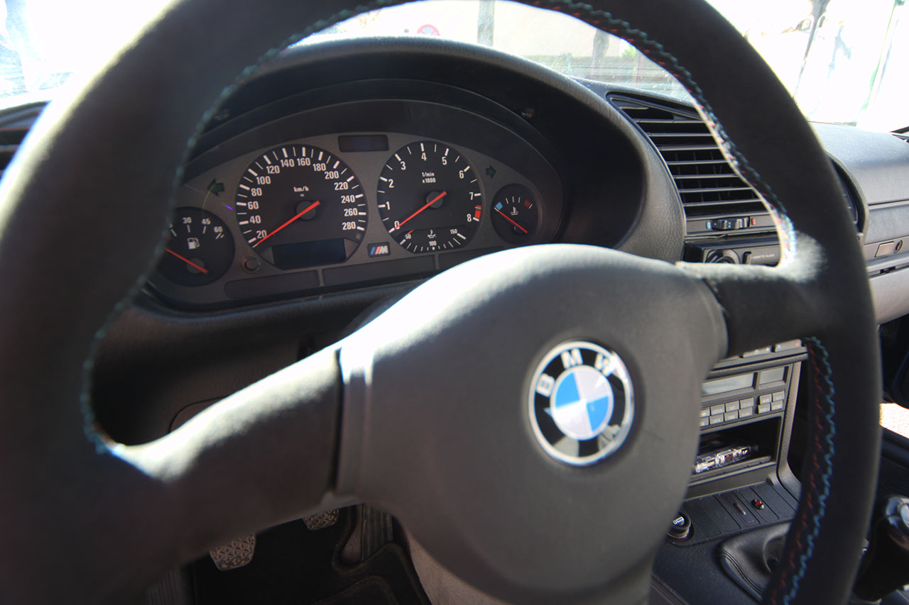 Après les présentions, il me raconte l’histoire de cette M3. D’origine italienne, elle a été importée en France en 2010 et repeinte dans la foulée. Alex, quant à lui, n’a pas souhaité de modifications techniques ou visuelles. Il a juste rajouté une barre anti rapprochement (la titine a 20 ans, il est conseillé de la rigidifier pour qu’elle tienne le coup) et fait refaire le volant (trouvé d’occasion sur ebay puis l’alcantara a été cousu par un artisan, un super résultat pour un prix réduit!)