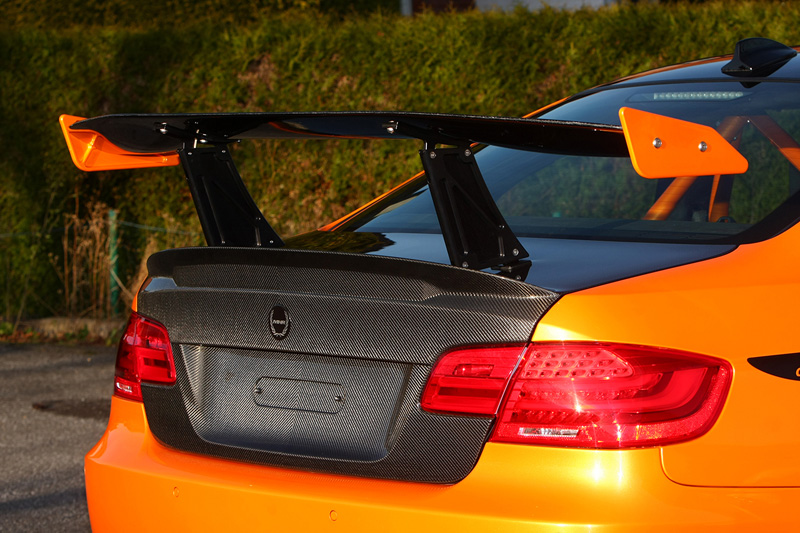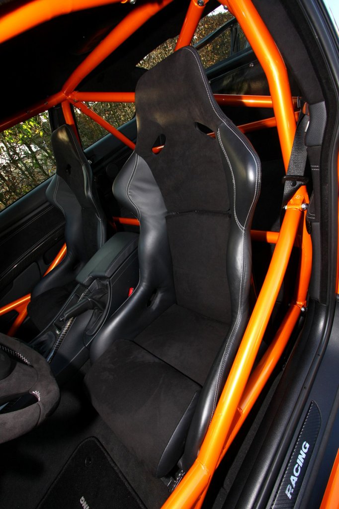 La carrosserie a vu quelques morceaux troqués pour du carbone: entrée d’air, capot de coffre en style CSL, spoiler avant ajustable, pont avant et arrière en fibre de carbone, diffuseur arrière.