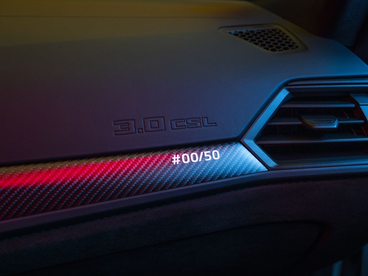 Les séries de chiffres sur les portes et le toit de la BMW 3.0 CSL, conçues dans le style des premières voitures de course, forment un pont entre le passé et le présent. Leur conception dans le style des numéros de course est basée sur le modèle historique de la première automobile BMW M développée pour la course de voitures de tourisme, tandis que le numéro 50 fait référence à l’anniversaire de BMW M GmbH. Un autre rappel des années 1970 est constitué par les deux logos BMW positionnés sur le pilier C, donc directement derrière le décrochement arrière du dessin de la vitre latérale, connu sous le nom de « pan de Hofmeister ».